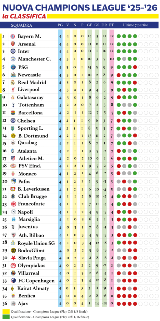 Notizie CLASSIFICA GENERALE Redazione Ottobre 28, 2025 Tags: home Continue Reading Previous: Risultati e analisi della prima giornata della fase 1 della Champions 25/26Next: Presentazione del quarto turno GironeUnico Lascia un commento Annulla rispostaIl tuo indirizzo email non sarà pubblicato. I campi obbligatori sono contrassegnati *Commento * Nome * Email * Sito web Salva il mio nome, email e sito web in questo browser per la prossima volta che commento. Related Stories Analisi 4° turno GironeUnico 45 min read Notizie Analisi 4° turno GironeUnico Novembre 5, 2025 Presentazione del quarto turno GironeUnico 42 min read Notizie Presentazione del quarto turno GironeUnico Novembre 4, 2025 Risultati e analisi della prima giornata della fase 1 della Champions 25/26 17 min read Notizie Risultati e analisi della prima giornata della fase 1 della Champions 25/26 Settembre 17, 2025